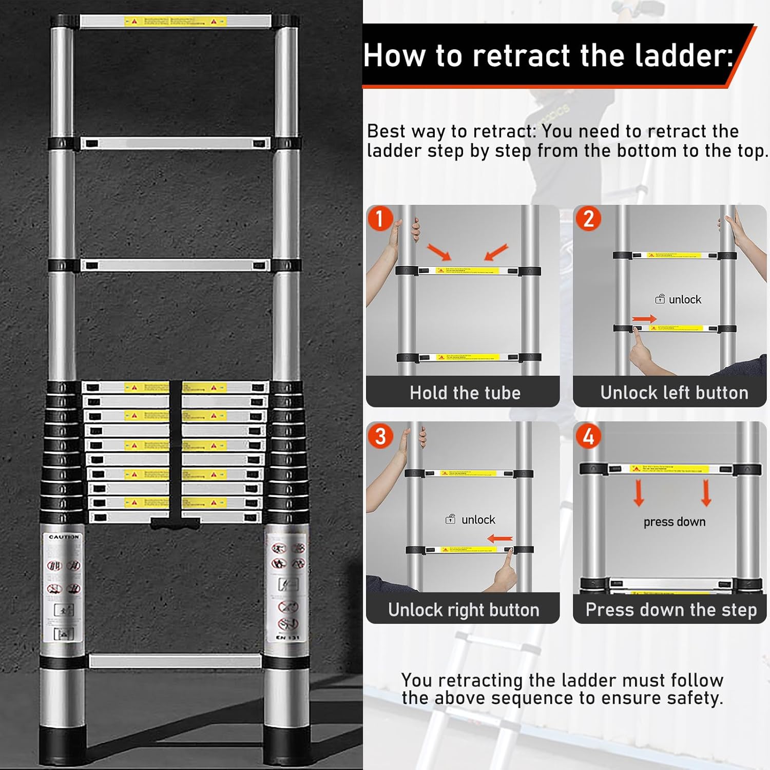 - Telescoping ladder (2.2 ft collapsed → 8.5 ft extended)